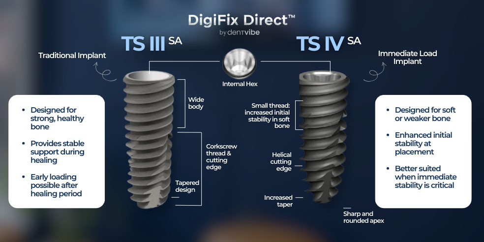 The implants required for this procedure are specifically selected from those suitable for “immediate loading.” These specialized implants differ from standard ones in terms of taper angle, thread depth, and surface coating—features proven to facilitate rapid loading. Our surgeons will decide on the most suitable implant brand for your specific bone structure and provide their recommendation.